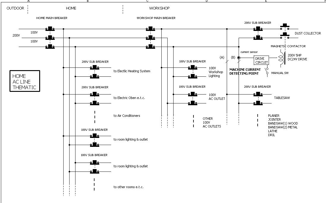 In Japan,the power line is feeded in as "sigle phase, 3wires".On the thematic,outer couple of wires is 200V and inner couples are 100V each. I use 200V for stationary woodworking machines and detect machine running by AC current sensor at the point"machine current detcting point(A or B)"