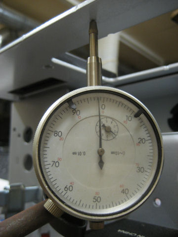 まずルーター/サフベースを載せない状態でダイアルゲージをセット。そしてルーター/サフベースを載せた状態では約0.2mmのたわみである。