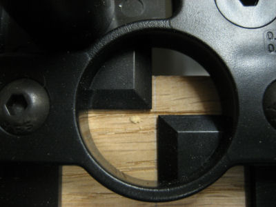 つづいてテノン加工のため材料をセットしようとすると開口部の中央付近で、この材料のサイズでは隙間が出来てしまう。材料を左右どちらかに寄せてセットしないと役に立たない。